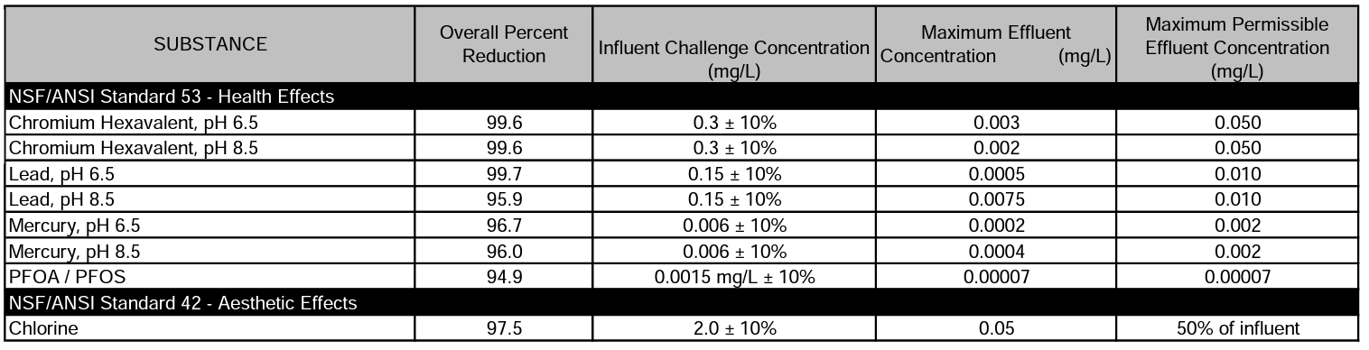 NSF-sertifisert for å redusere bly, seksverdig krom, kvikksølv, klor og PFAS.